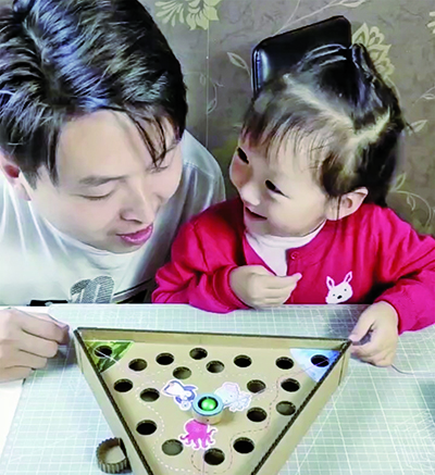 张帅的制作并不是简单的复制,他还要考虑是否适合女儿以及操作的难易程度。“孩子玩玩具要考虑他们的成就感。如果游戏过难也容易有挫败感,而太简单又容易无聊。我会适当增加趣味性,把大人的游戏简单地改造成孩子的玩具。”