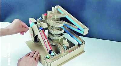 其中,最让他头疼的是制作“弹珠爬楼梯”——通过转动转盘,将弹珠送上一个个跳动的楼梯上,再通过旋转滑梯让弹珠滑下,循环不断地使弹珠爬上“楼梯”。