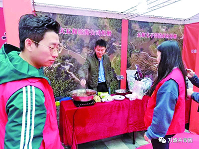 一部分青年志愿者在定点直播间向全国各地的消费者重点推介万盛特色农产品,其中包括农家红薯粉、腊肉、蜂蜜、糯米酒等。其他青年志愿者则两三个一组对参加展销的所有商家和商品进行逐一的介绍和宣传,推广万盛当地的生产企业和扶贫农特产品。穿着红马甲带货直播的青年志愿者成了现场一道亮丽的风景线,取得了较好的销售业绩和推广效应。