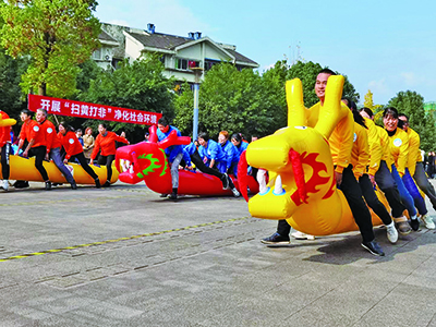 在文艺汇演结束后,白马社区第十一届体育文化节正式开始。本次活动设置了摸石过河、企鹅漫步、竞速龙舟三个项目,报名参加比赛的共有19支代表队。活动现场,健身教练带领参赛居民做了简单的热身运动,并详细介绍了比赛规则。比赛开始后,各支代表队充分发扬了“友谊第一,比赛第二”的优良作风,用尽全力展现自己的实力,现场观众的喊声、笑声、加油声此起彼伏,呈现出一片欢腾、祥和的景象。