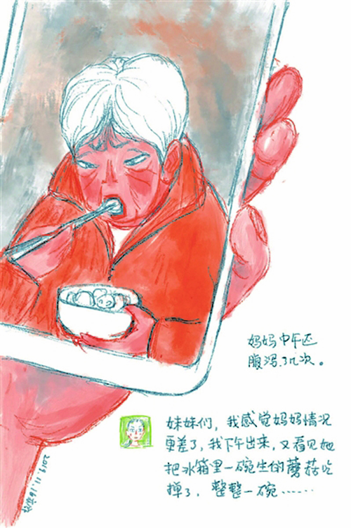 “那段时间,我近乎盲目地相信艺术可能带来奇迹,而且我认为这也许是通往妈妈内心的唯一途径了。”亦邻说,母亲看到她画的父母当年的故事,表现得非常开心,讲道:“你现在专门画我和你爸爸,画得好!我给你鼓掌!”亦邻由此想到,也许每天给妈妈画一件过去的事情,和她聊一聊往事,刺激她的记忆,可能会延缓她的脑萎缩。