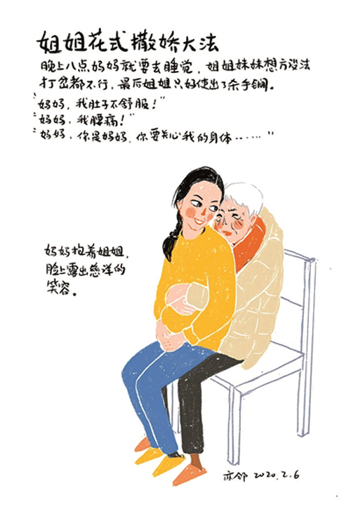 亦邻仍然用绘画的方式记录着母亲的生活。在《我还记得》一书中,一大部分都是关于姐姐清雅照顾母亲的日常生活的内容。比如亦邻画了一幅《姐姐花式撒娇大法》,上面写着:晚上八点妈妈就要去睡觉,姐姐妹妹想方设法打岔都不行,最后姐姐只好使出了杀手锏。“妈妈,我肚子不舒服!”“妈妈我腰痛!”“妈妈,你是妈妈,你要关心我的身体……”妈妈抱着姐姐,脸上露出慈祥的笑容。