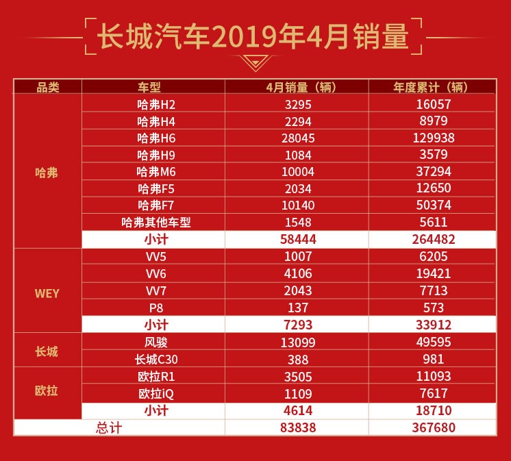 逆势上扬 长城汽车4月共售新车8.4万辆 同比增长2.5%