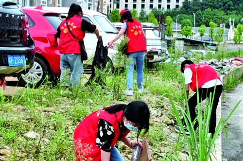 丰益13片区内含多栋廉租房,房前的空地杂草丛生,堆积的垃圾多,是此次活动的重点清理区域。“洁小青”志愿者们两人一组,沿着道路一线铺开,一人拿垃圾袋,一人捡拾垃圾,配合默契,干劲十足。炎热的天气丝毫没有影响大家的热情,不一会儿,“洁小青”志愿者们就已经“战果累累”,社区面貌也焕然一新。