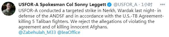 美军空袭塔利班击毙5人美官员:未违反和平协议