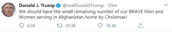 特朗普:驻阿富汗美军应在圣诞节前撤回美国