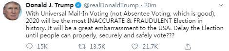 暗示希望推迟选举?特朗普:邮寄投票最具欺骗性