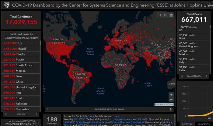 全球累计新冠确诊病例超1700万累计死亡逾66.7万例