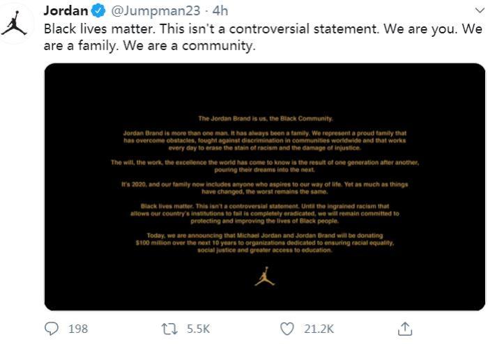 迈克尔·乔丹携品牌捐款1亿美元支持种族平等事业