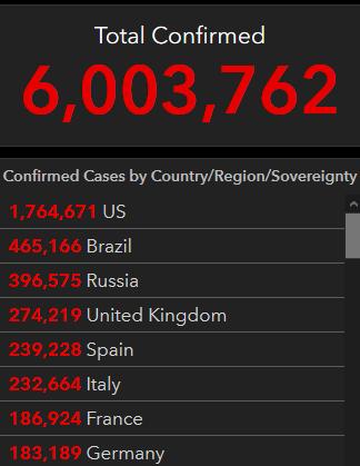 约翰斯·霍普金斯大学:全球累计确诊新冠超600万例