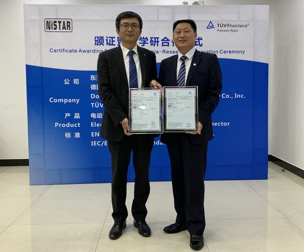 东莞日新电动汽车充电部件获颁TUV莱茵型式认证、CE和CB认证证书