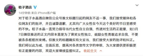 公众号推文被指侮辱女性 桔子水晶发声明称将全面反思
